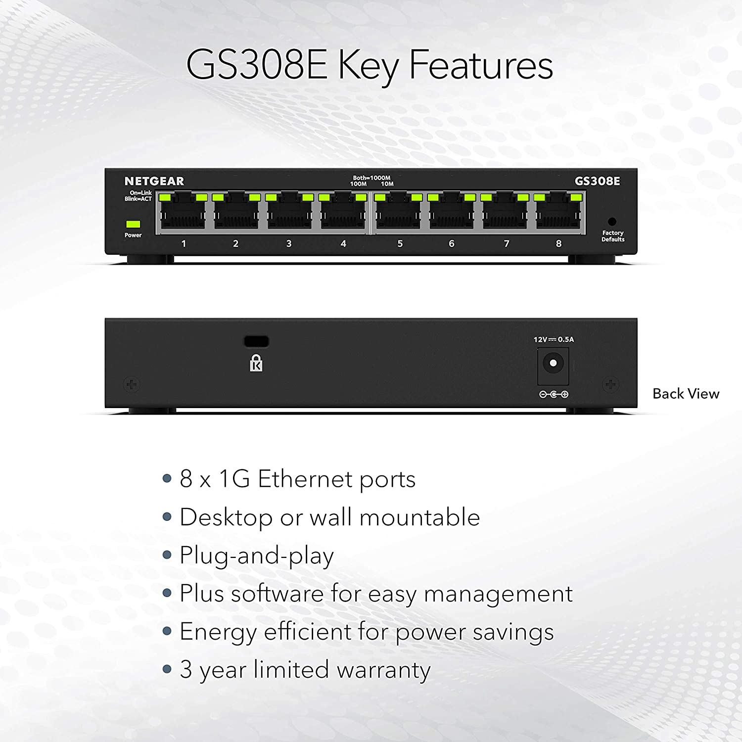 Commutateur NETGEAR 8 ports Gigabit Ethernet Plus (GS308E) - Bureau ou montage mural, concentrateur de réseau domestique, répartiteur Ethernet de bureau, fonctionnement silencieux