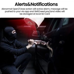 - Alerts & Notifications: Abnormal open/close actions activate alarms, push messages via the app and SMS (additional charges may apply), and videos are stored on the local SD card.