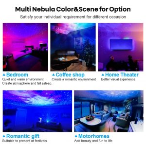 - 16 Million Colors and Different Themes for Option: Unlike traditional star projectors with only 7 colors, the SP01 offers a rich color palette with 16 million options. The app includes a color adjustment panel to change the color of the nebula accurately and uniquely. Set the nebula’s movement speed and choose from frequently used themes for quick and convenient selection.